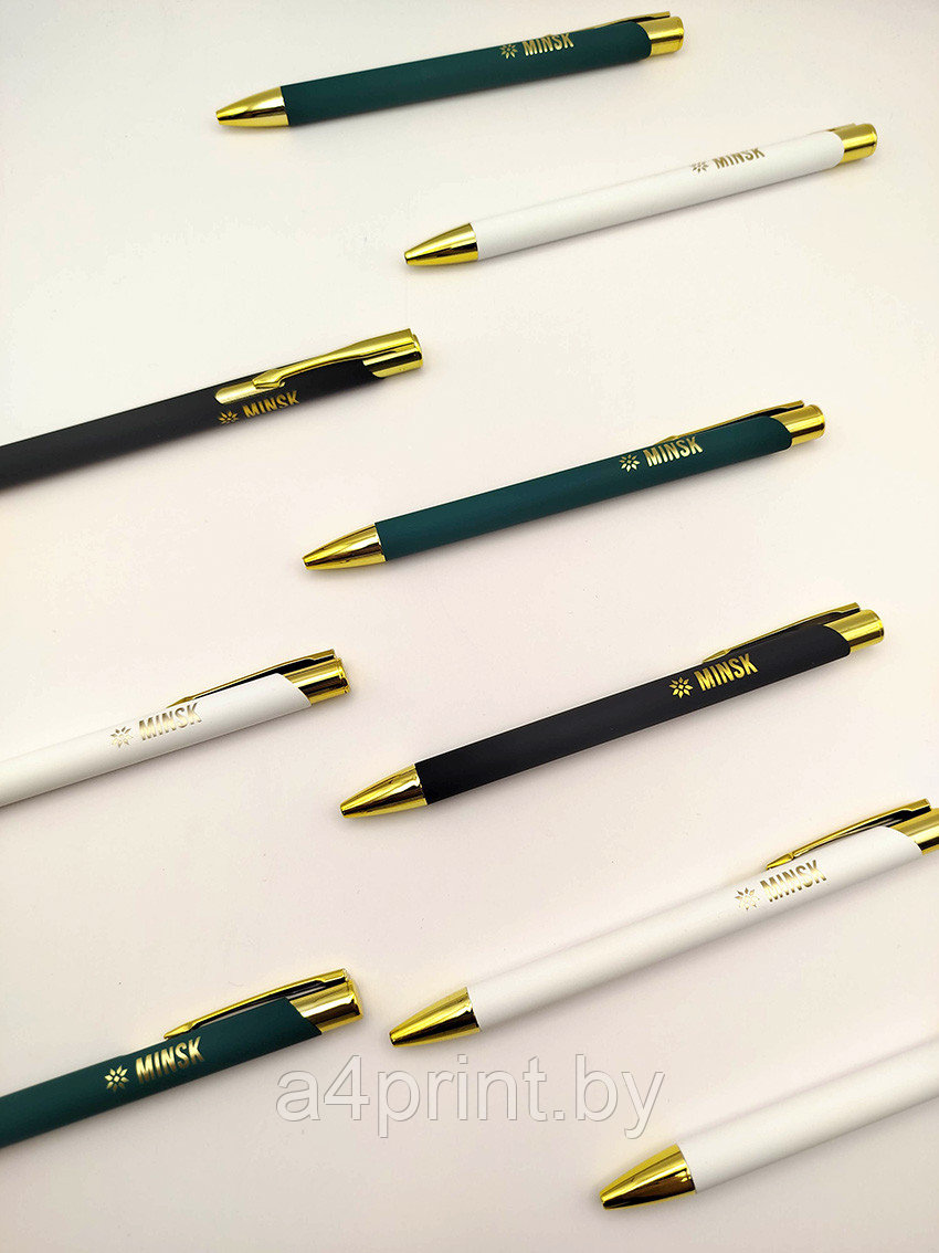 Ручки доступны в следующих цветах: черный-золото, белый-золото, зеленый-золото. Приятная матовая поверхность. Материал - металл с латексным напылением. Гравировка слова Minsk - зеркальная, золотистая. Модель ручки Legend Soft Touch Mirror Gold. Отличный сувенир из столицы Республики Беларусь. Собственное производство. Низкая цена.